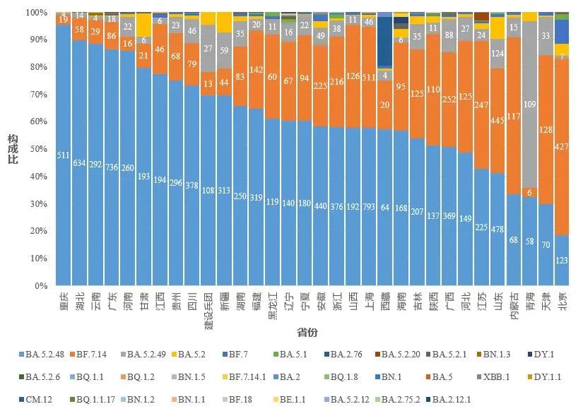 图4-2 各省份新冠病毒变异监测情况说明:1.采样时间:2022年12月1日-2023年2月2日; 2.图中标记的数字分别为BA.5.2.48、BF.7.14和BA.5.2.49进化分支有效基因组序列数量。