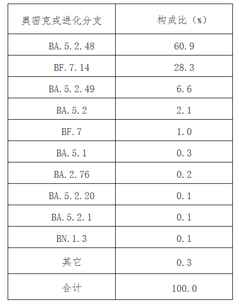 (一)总体情况。2022年9月26日至2023年2月6日,全国共报送23217例本土病例新冠病毒基因组有效序列,均为奥密克戎变异株,共存在76个进化分支,主要流行株为BA.5.2.48(53.0%)、BF.7.14(24.1%)和BA.5.2.49(14.8%)。BA.5.2等20种进化分支构成比在0.1%-2.5%之间,53个进化分支的构成比小于0.1%(共占0.7%)(图4-1)。