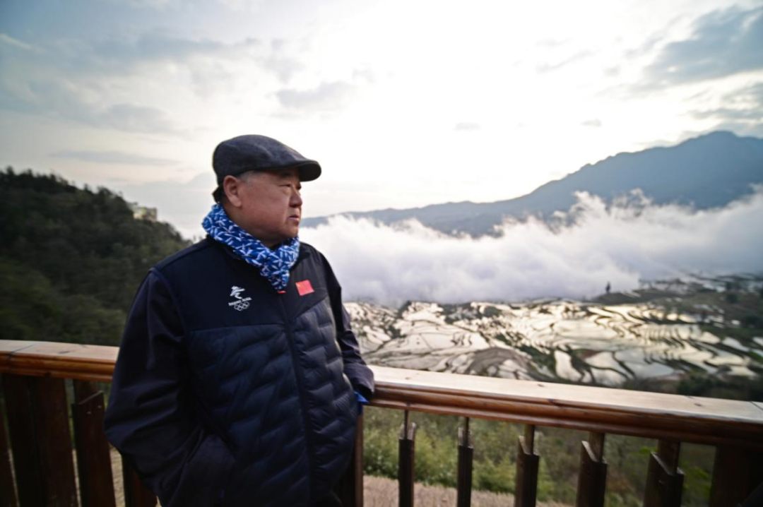 世界文化遗产红河哈尼梯田的农耕文化艺术及其所展现的独特文化魅力,令莫言印象深刻。7日,莫言一行到了红河哈尼梯田核心区元阳县,实地走访了多依树梯田和阿者科村,详细了解世界文化遗产红河哈尼梯田深厚的历史文化和人文资源。下午,莫言一行到全福庄中寨深入了解哈尼梯田“稻鱼鸭”种养模式。梯田之行,令莫言老师印象最深的是,从山腰到峡谷,成百上千级的梯田,宛若天梯,犹如雕刻,仿佛每一块土地都在讲述着她不一样的故事。
