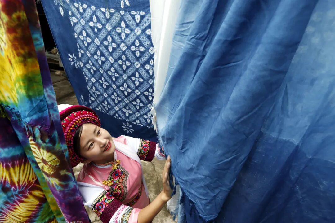 绘图、扎缝、染漂、扎花、碾平……白族扎染全靠手工制作,色彩多以蓝白为主色,白色在白族地区代表吉祥如意,青色则代表希望、纯朴和真挚,青白结合就表示“清清白白,光明磊落”。随着时间流逝,扎染的蓝与白,透过千年时光,已浸染成为白族人生活的底色。