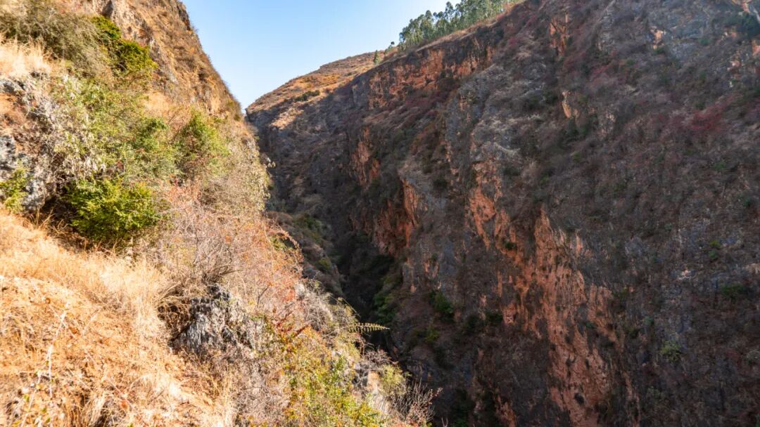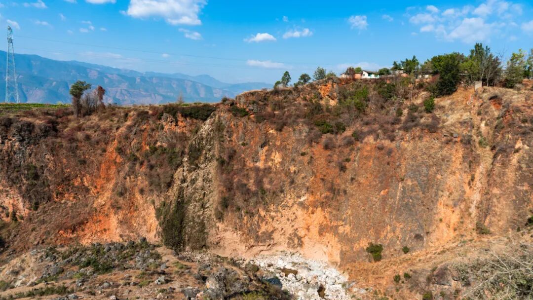 滇西北永胜县地震“天坑”,位于永北盆地西北红石崖,地处西关山与芮官山之间,南距永胜县城2公里。2005年,中国地震局批准将永胜地震“天坑”,设立为国家级典型地震遗址。中国地震局在批复中指出,永胜红石崖国家级地震遗址,包括天坑、槽谷、崩塌、滑坡、裂缝、断层、水系断错等古地震地貌和历史地震遗迹,是宝贵的自然遗产和科普宣传教育场所,具有极高的科学研究和旅游开发价值。