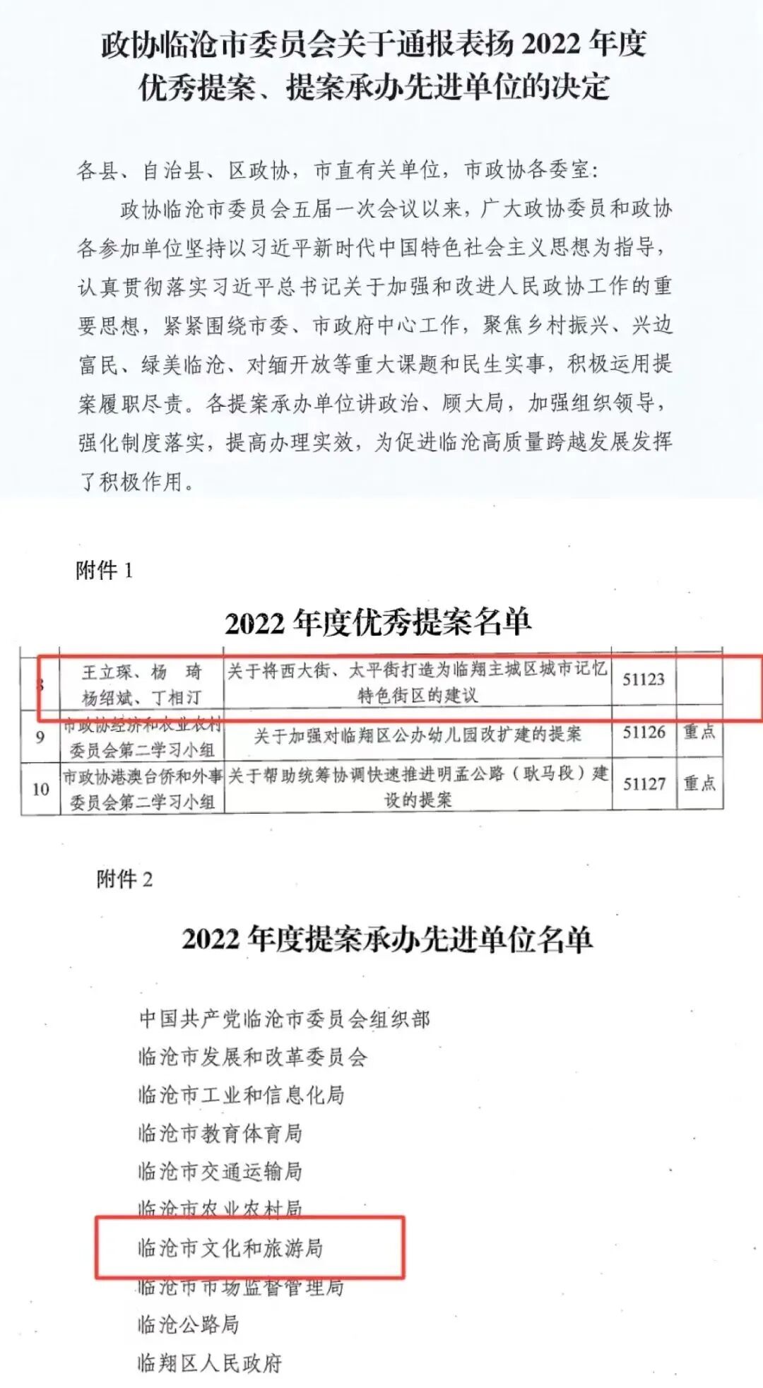 日前,在临沧市政协五届二次会议第六次全体会议上,临沧市文化和旅游局等10家单位被表彰为2022年度提案承办先进单位。临沧市文化和旅游局王立琛等提交的《关于将西大街、太平街打造为临翔主城区城市记忆特色街区的建议》入选2022年度优秀提案名单。
