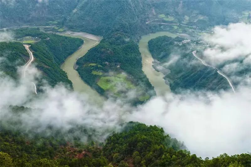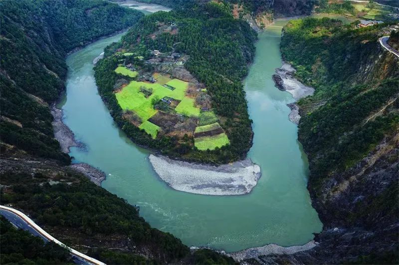 怒江第一湾,可能你没听说过这里,但一定在某处见过这里的“网红照”。奔腾的怒江水离开美丽的高黎贡山,江面逐渐收紧,水流越发湍急,到了怒江州贡山县丙中洛乡日丹村附近,滔滔的江水被王箐大悬崖绝壁阻隔,江水流向由原来的北南流向改为东西流向,流出300多米后,又被丹拉大山隔断再次调头由西向东急转,一道马蹄形将山脉分割,“桃花源”坎桶村便坐落在三面环水的半岛状小平原上,这便是怒江第一湾。