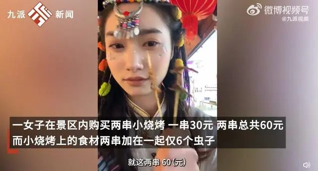据九派新闻报道,2月13日,在云南丽江,一女子在景区内购买两串小烧烤,一串30元,两串总共60元,而小烧烤上的食材两串加在一起仅6个虫子。视频内容显示,女当事人举着两串烧烤,边吃边说:“我特地点了这么小的,告诉我一串30,就这两串60。”