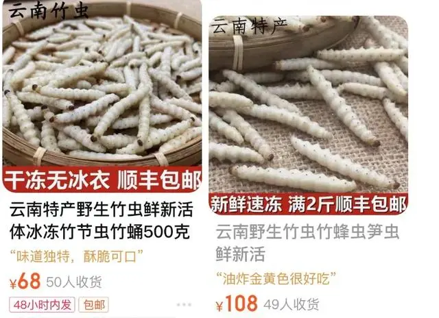 网络购物平台显示,1斤冰冻竹虫价格不等,但最少也要60多元,贵的还有1斤100多元的。