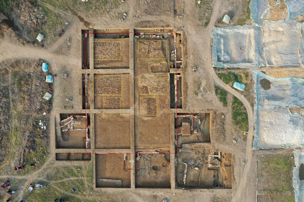 安徽凤阳明中都遗址前朝区正殿西侧附属建筑夯土台基及磉墩分布。安徽省文物考古研究所供图
