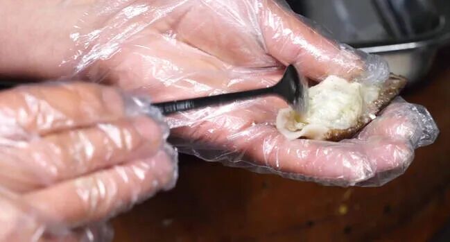把新鲜的羊肚菌切掉根部洗净,用剪刀把羊肚菌剪开一边,再把虾滑塞进中空的羊肚菌肚子里就好了,进蒸锅上气后计时10分钟关火。