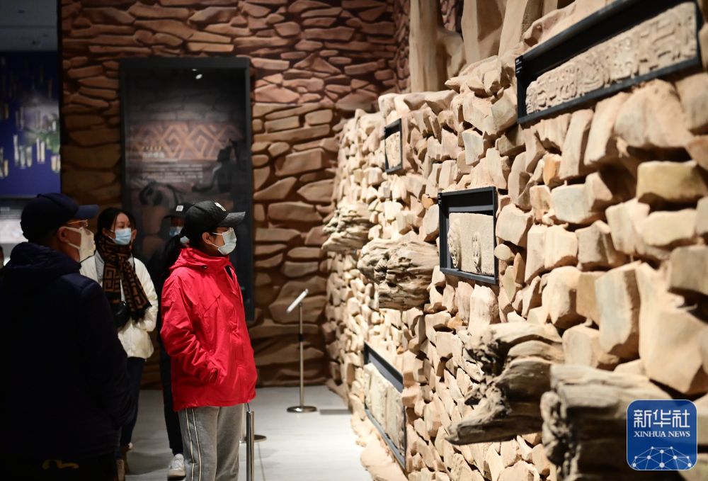 1月25日,在陕西考古博物馆,游客参观石峁遗址展区。新华社记者 李一博 摄