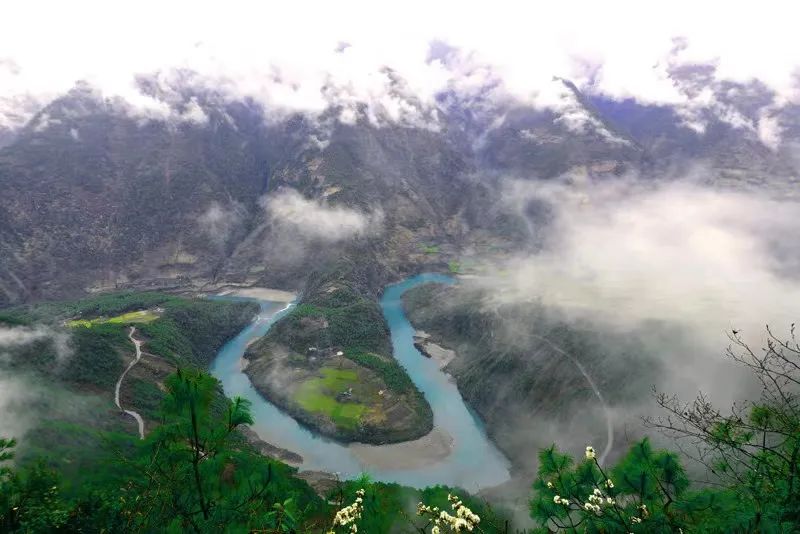 怒江第一湾,可能你没听说过这里,但一定在某处见过这里的“网红照”。奔腾的怒江水离开美丽的高黎贡山,江面逐渐收紧,水流越发湍急,到了怒江州贡山县丙中洛乡日丹村附近,滔滔的江水被王箐大悬崖绝壁阻隔,江水流向由原来的北南流向改为东西流向,流出300多米后,又被丹拉大山隔断再次调头由西向东急转,一道马蹄形将山脉分割,“桃花源”坎桶村便坐落在三面环水的半岛状小平原上,这便是怒江第一湾。