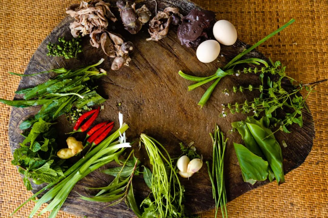 哈尼蘸水鸡的灵魂是蘸水。将采自田间的新鲜芫荽、薄荷、花椒、小米辣、香柳、葱姜蒜、苤菜、地椒等,还有自制的哈尼豆豉,与煮熟的鸡肝、鸡胗、鸡蛋一起搅拌,浇上滚烫的鸡汤,调制出一碗色香味俱全的蘸水。煮熟的鸡肉,搭配上美味的哈尼蘸水,一道“哈尼蘸水鸡”就制作完成了。