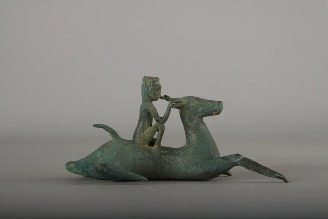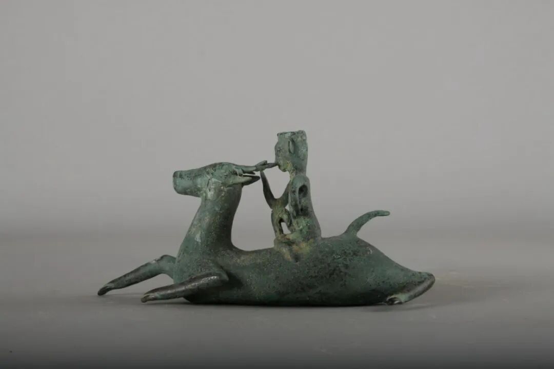 骑鹿俑造型生动,座系人、鹿分铸后焊接而成,鹿身中空,通体表饰剔刺梅花纹,鹿头上一对长耳和枝状犄角,呈昂首翘尾状;一人骑在鹿背上,头顶有榫口,似有插件。人俑铸实、裸身、前额凸出、粗眉巨眼、阔嘴、大耳;表情端庄;右手屈肘托于膝盖,手掌平展作招示状。左手折弓撑于腰部,左腿曲弯内向坐于鹿背,整体自然,形态逼真。鹿通“禄”在古代有吉祥之意。在更深的层次上鹿被神圣化,被视为“太平之符”的祥瑞,亦是可通天地的使者,有较高的历史和艺术价值。