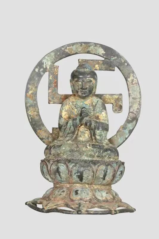 宋代万字背光鎏金大日如来铜坐像出土于大理弘圣寺塔,通高10.9厘米,底座直径6.14厘米,铜鎏金工艺。造像形象独特、比例协调、线条流畅、铸造工艺精湛,是大理州博物馆的镇馆之宝之一。