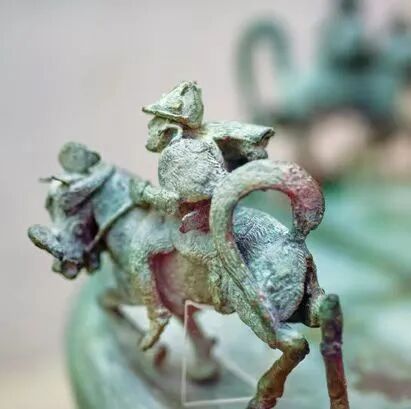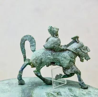 骑鹿俑,通长20.5厘米、高10.5厘米,年代为东汉, 昭通市昭阳区守望乡白泥井梁堆出土,1984年被昭通地区文物管理所征集,现收藏于昭通市博物馆,为博物馆珍贵文物之一。