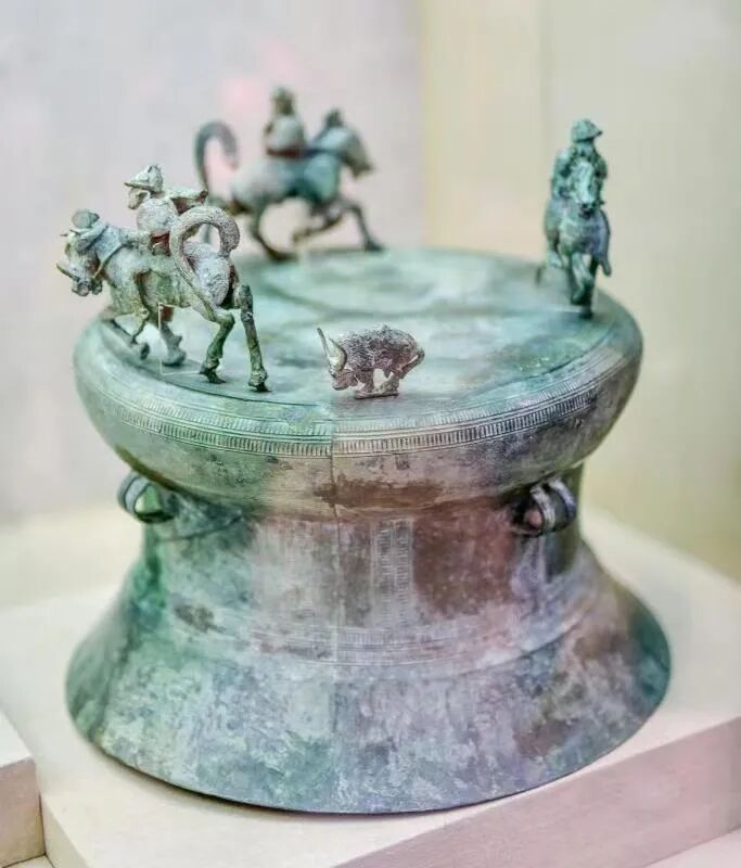 三骑士铜鼓出土于玉溪市江川县李家山51号墓,是古滇国时期用于祭祀的重要礼器,专家将其年代测定为西汉时期,现为李家山青铜博物馆收藏的镇馆之宝。