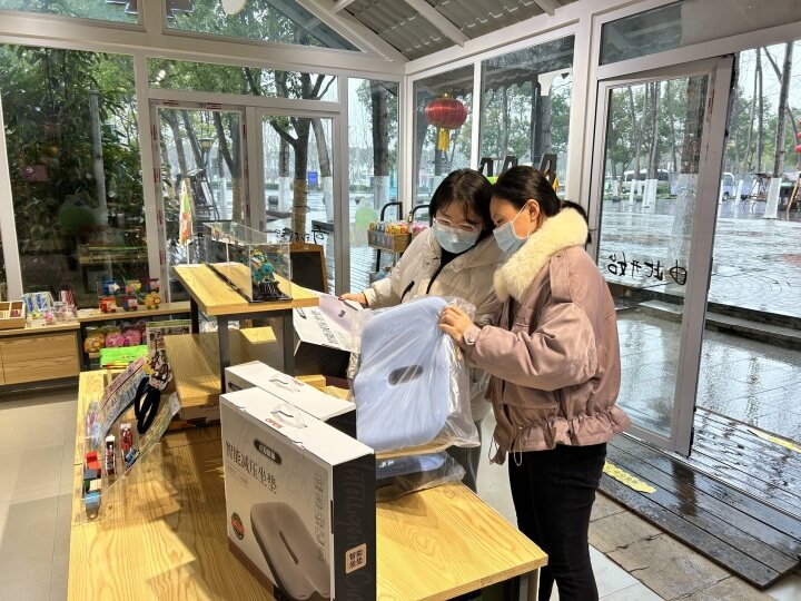 游客在合肥滨湖国家森林公园文创店选购智能减压坐垫 方宇 摄
