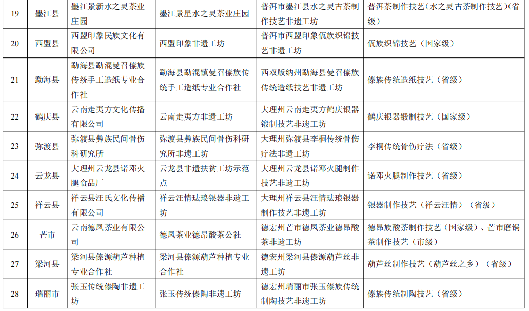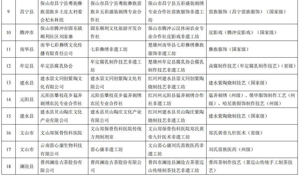 按照《云南省级非遗工坊认定和管理办法》要求,经各州、市文化和旅游局申报,评审组评审,推荐出35家拟认定为云南省级非遗工坊,现将推荐名单予以公示。