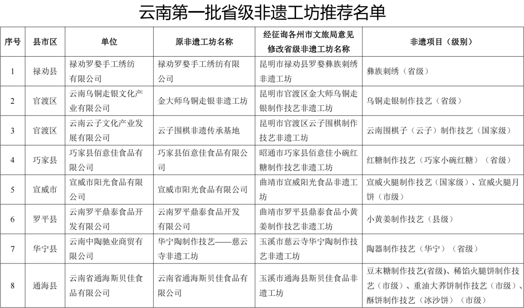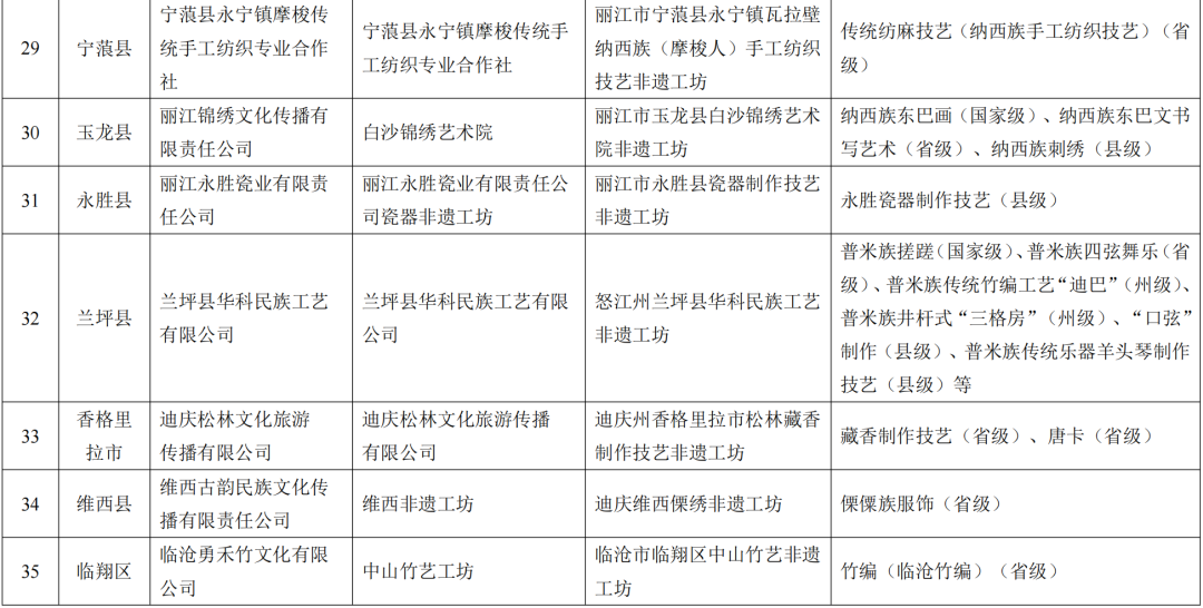 按照《云南省级非遗工坊认定和管理办法》要求,经各州、市文化和旅游局申报,评审组评审,推荐出35家拟认定为云南省级非遗工坊,现将推荐名单予以公示。