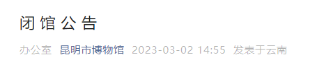 昆明市博物馆、昆明飞虎队纪念馆因展厅电路检修维护,将于2023年3月4日(星期六)闭馆一天,3月5日(星期日)起正常开放。由此给您带来不便,敬请谅解。