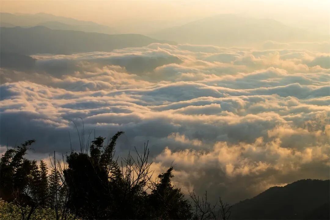 随着天空渐白,山峦葱茏,云雾霭霭,流云奔涌,群山浮动。晨风追逐云雾,云雾描摹山脉,连绵的远山与奔腾的云海相依相偎,一动一静间,变化万千,演绎云海奇观。洁白的流云把一座座山峦遮掩得若隐若现,云雾轻轻地碰撞、交融、推搡、缓慢翻腾、起伏,悄无声息向脚下翻滚而来。滚滚“浪涛”激荡着红日升腾出“海”面,霞光笼罩,将山河云海染成了金色,神奇壮观、震撼人心。