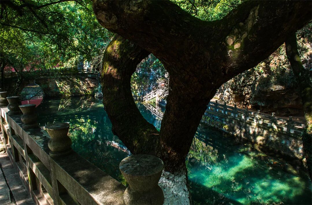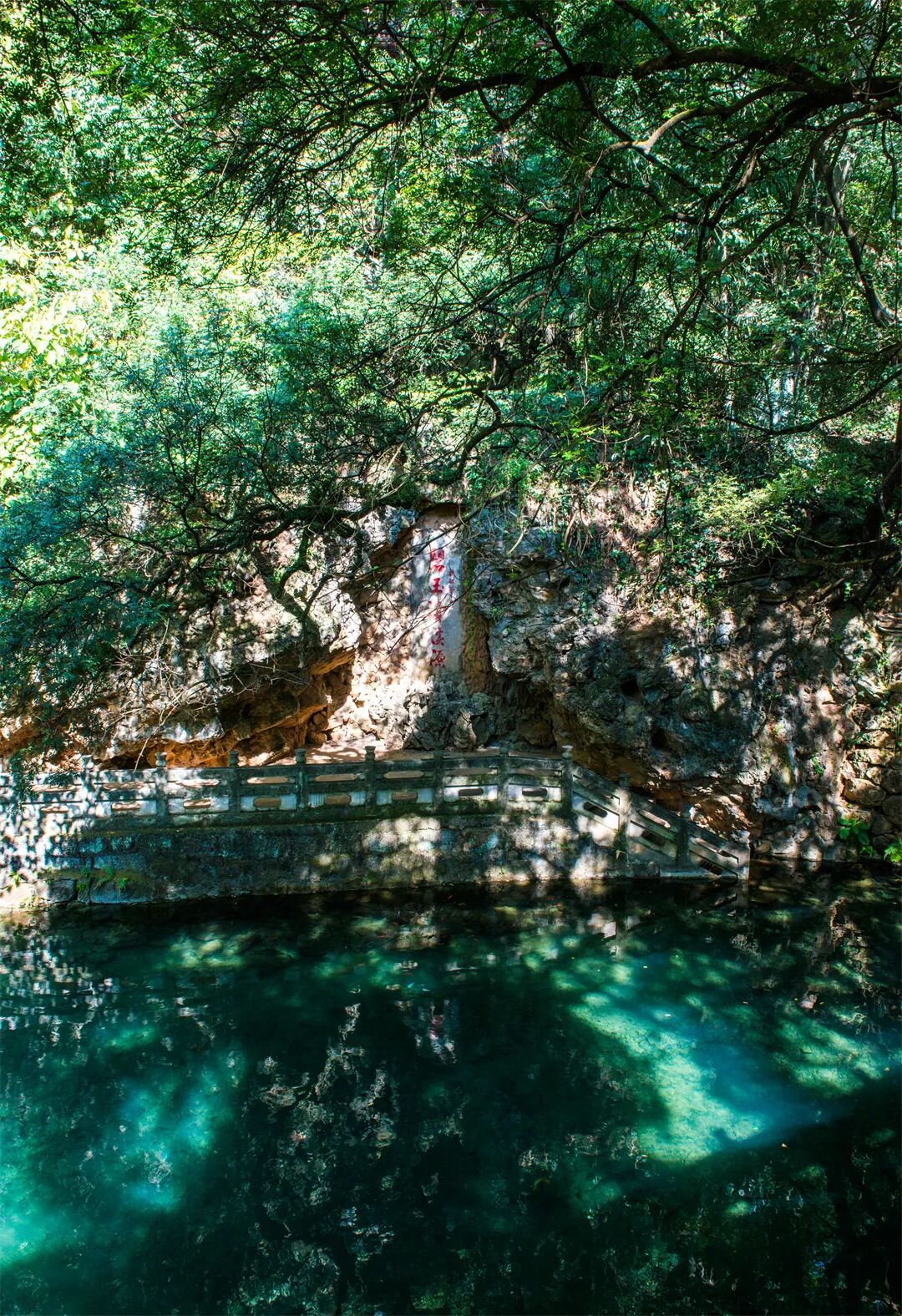 九龙池潭泉众多,以山岩峭壁下,一亩见方、清澈见底的大龙潭最为吸引人。潭周围古木参天,绿树成荫,树干竞相伸向潭面,甘甜清冽的清泉从泉眼悄悄涌出,成群结队的鱼儿在斑驳的树影中摇尾相戏,微风吹来,涟漪轻荡,树影碎散,别有一番趣味。