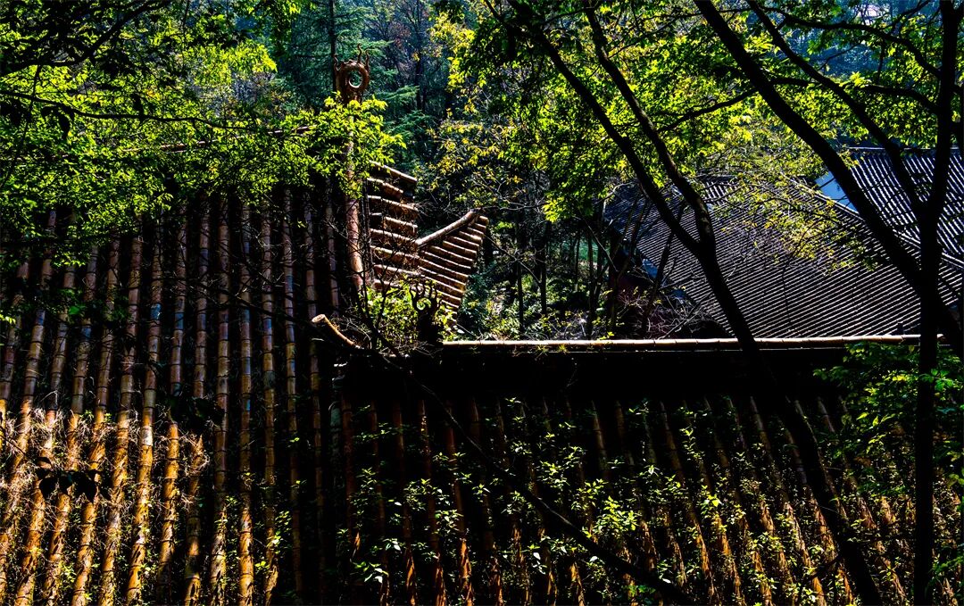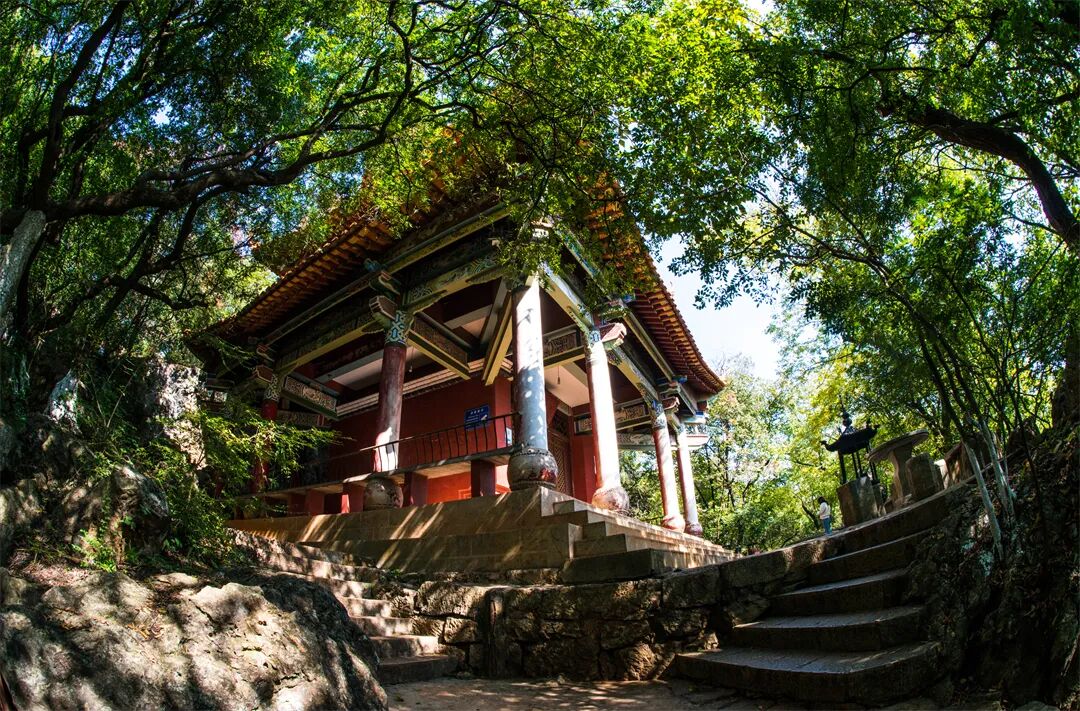 秀山保存了较为原始的植被群落,林木繁茂,古树参天,藤蔓青翠。在此基础上,历代匠人因形就势,将亭、台、楼、阁、廊、漏窗等传统园林元素巧布其间,充分利用“借景”“对景”“框景”“漏景”等传统构园手法,将湖光山色、城池村落及田园风光融入其中。庙宇建筑和自然环境的完美融合,使秀山各建筑群成为一座座布局精美的园林。