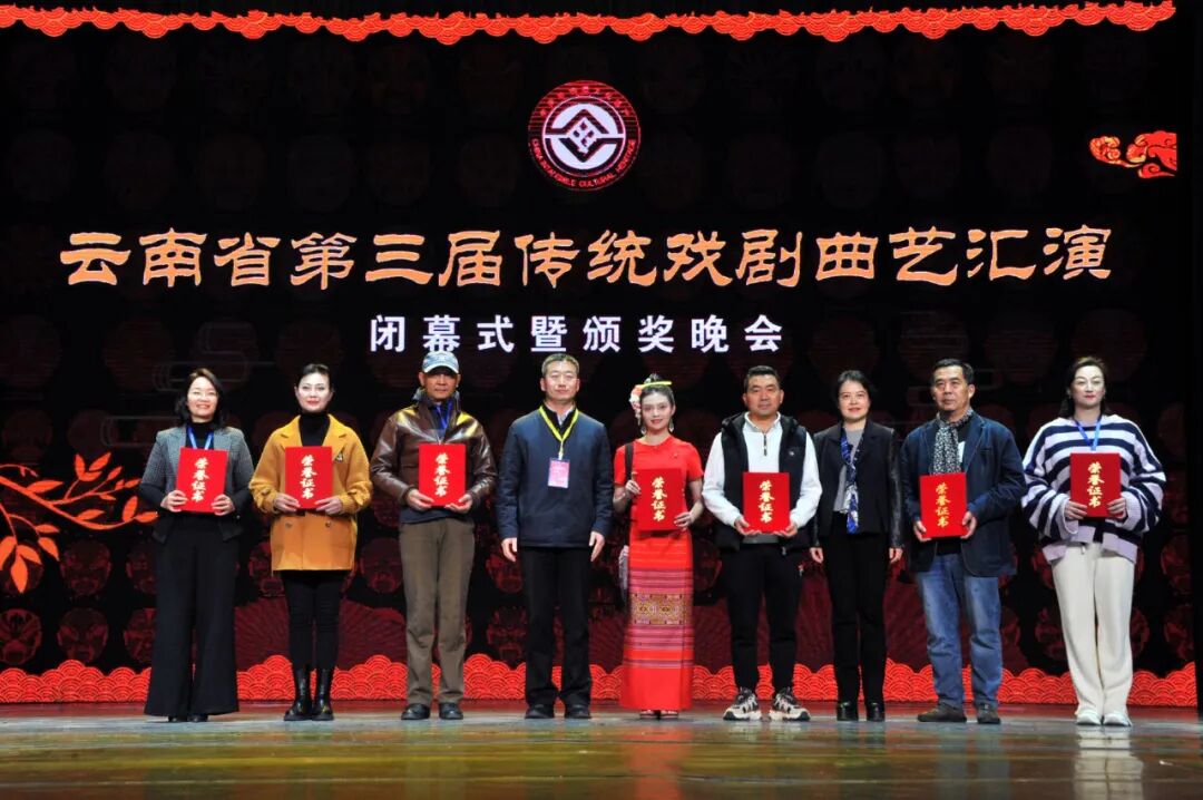 本届传统戏剧曲艺汇演有来自全省13个国家级非遗代表性项目、11个省级非遗代表性项目、2个省级保护传承基地的作品,包括滇剧、花灯戏、皮影戏等,参演单位共42个,剧目达58个,参演人员800余名。其中,13个剧目进入颁奖晚会,并设传承奖、示范奖、汇演奖、组织奖等。临沧市代表队苏爱群、刘丽、杨艺芳、李应林等23名滇剧演职人员带来的《白蛇传•断桥》,将我国家喻户晓的四大民间爱情与非遗文化进行浪漫结合,一曲“千年修得惊世梦,深眷难报往事恩”,深情演绎了白娘子和许仙凄婉动人的爱情故事,让现场观者深陷其中,大受感染,最终荣获本次评选的最高奖项一一传承奖(金奖),并作为优秀作品在颁奖晚会中演出。