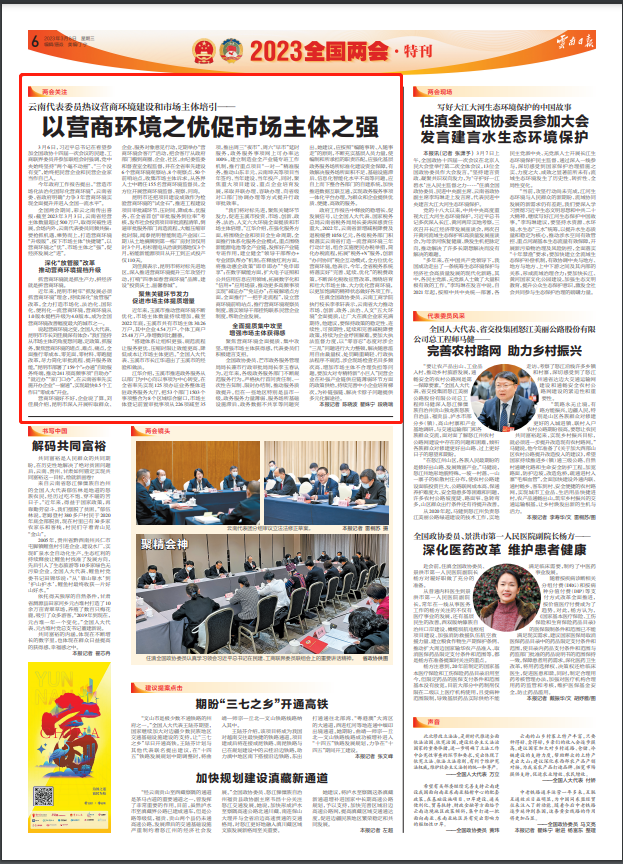 全国两会期间,彩云之南传出喜报:截至2023年3月3日,云南省经营主体数量超过500万户,取得突破性进展。会场内外,云南代表委员同频共振:要抢抓机遇、乘势而上,打造营商环境“升级版”、按下市场主体“快捷键”,以营商环境之“优”、市场主体之“强”,促经济发展之“进”。