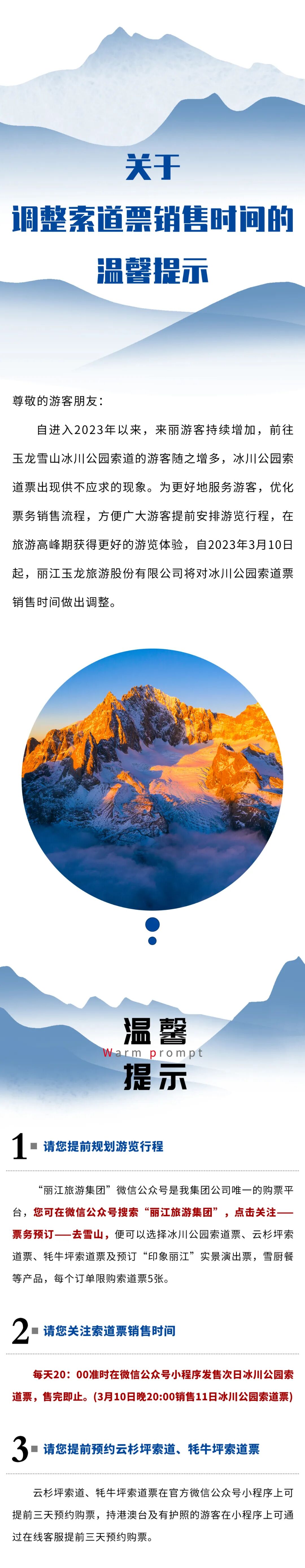注意啦!丽江玉龙雪山冰川公园索道运营时间有调整 2023-03-09 12:28 0 为优化票务销售流程,方便广大游客提前安排游览行程,在旅游高峰期获得更好的游览体验,3月10日起,丽江玉龙雪山冰川公园索道票销售时间将做出调整。具体内容如下: ↓↓↓ (扫码购票) 来源 “丽江旅游集团”微信公众号 责编 木琼晓 杨金敏 审核 华芳