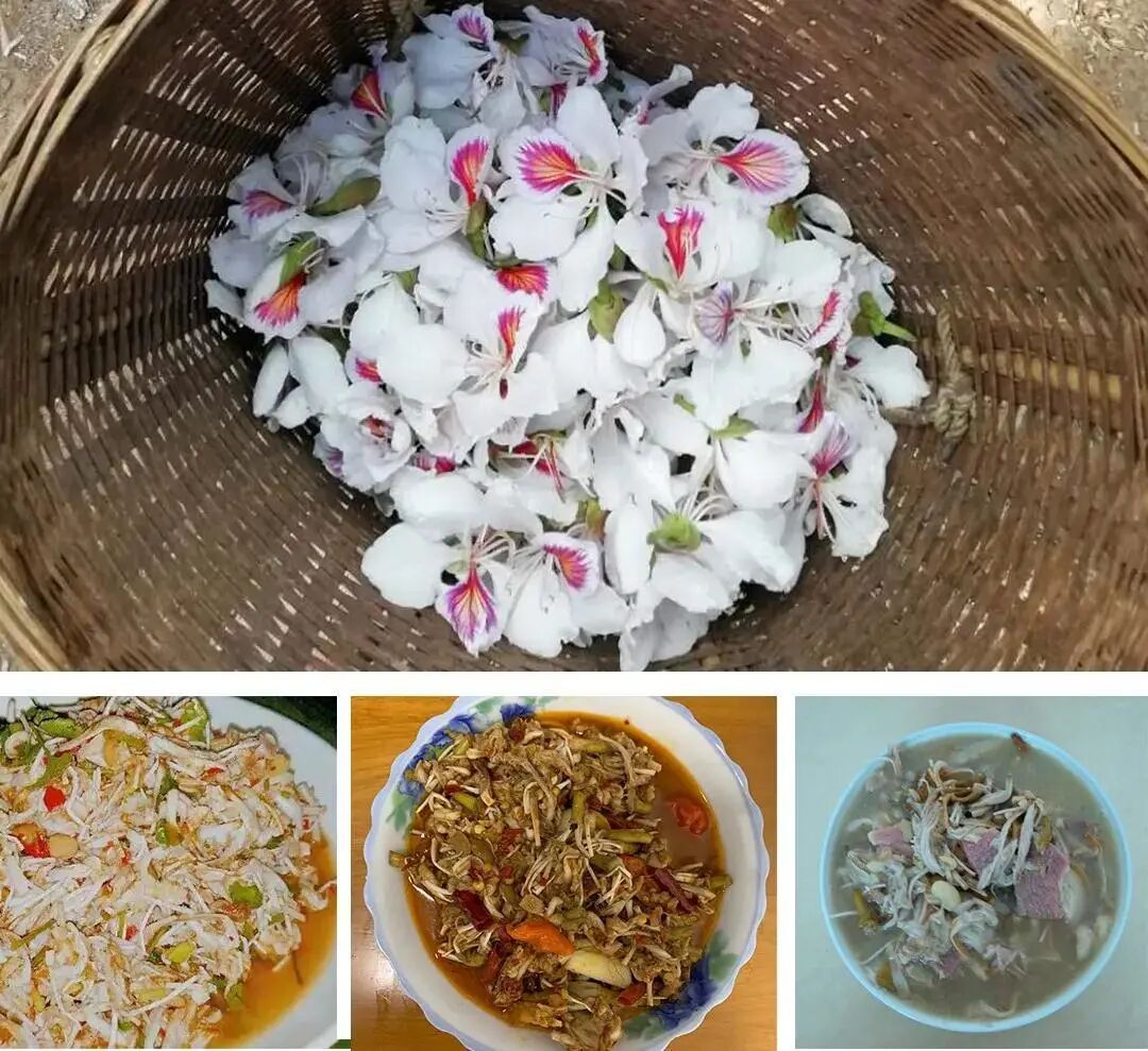 将掉落的花朵收集起来,除去花蒂与雌蕊,再用清水浸泡除去杂质,便可入锅进行烹饪,微带苦味的花瓣搭配上腊肉的味道,爽口下饭,腊肉的烟熏气味与花瓣的回甘,让你吃上一口便回味无穷。