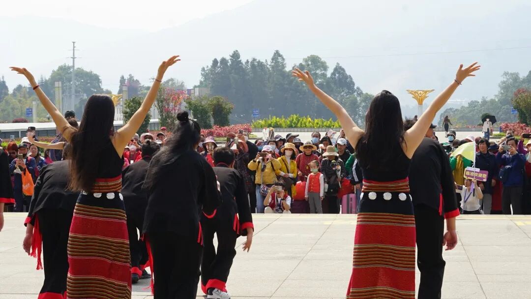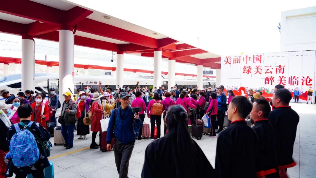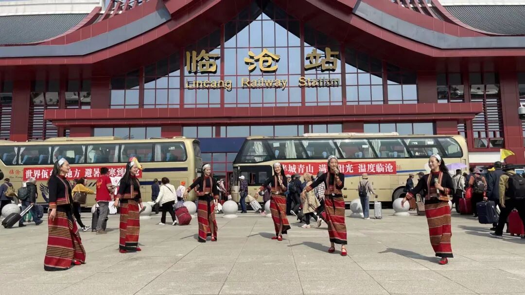 游客们出站后,临沧火车站前广场正表演原创舞蹈《激情加林赛》,将当天欢迎仪式气氛推向最高潮,热情洋溢的民族歌舞表演和富有临沧民族特色的文化节目,引得旅客纷纷驻足欣赏。随后,临沧市文化和旅游局分管领导向游客们致欢迎词,感谢他们选择来温暖临沧旅游。企业代表为每位游客敬上一杯临沧暖茶和纪念品。《昆明临沧》演员们唱着“从昆明出发,带上春城的温暖,相约临沧”与现场的游客们载歌载舞。欢迎仪式后相关负责人将游客们依次送上旅游大巴车并挥手告别。