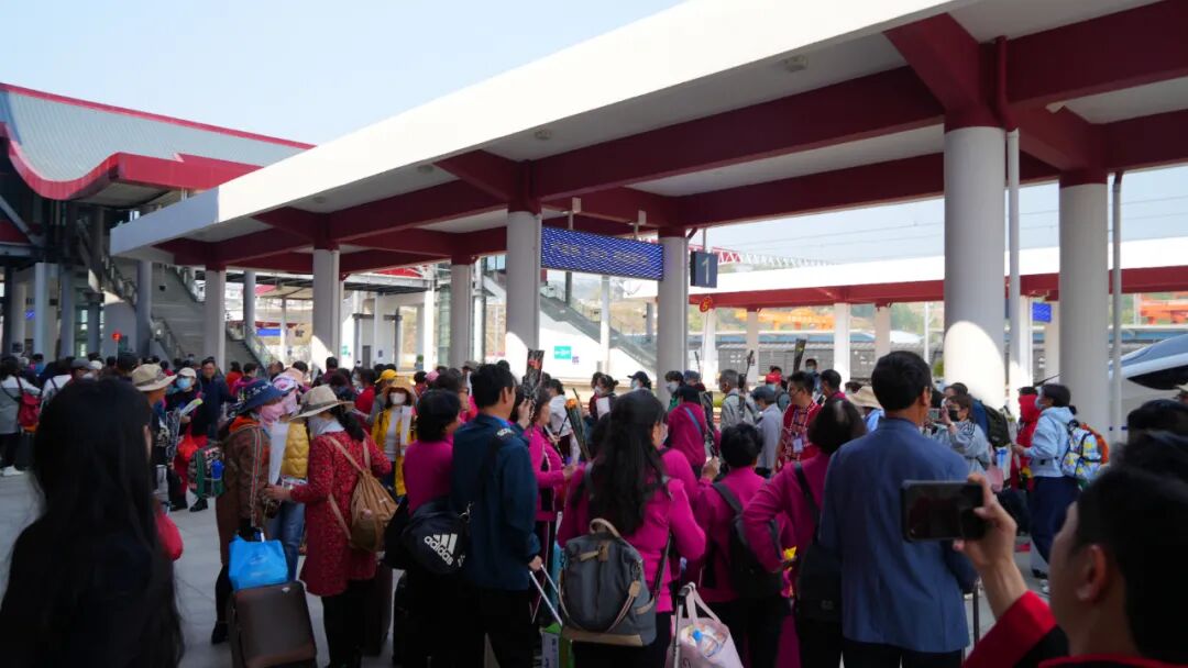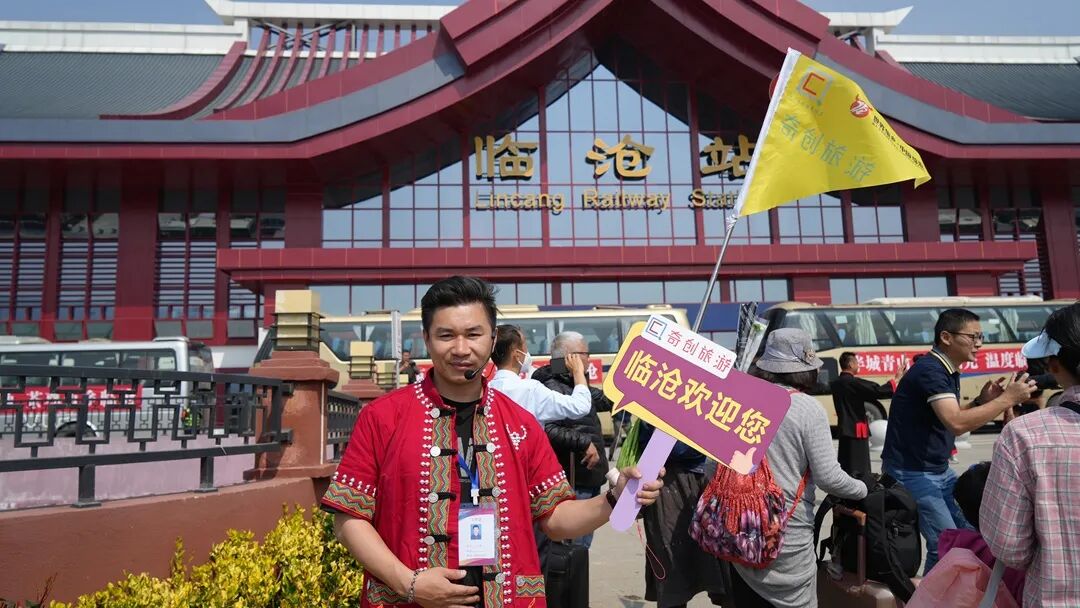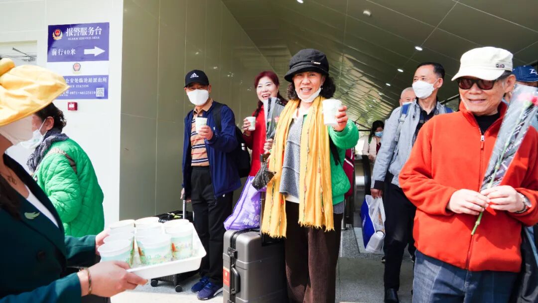3月10日下午14时55分许,从昆明至临沧的D8107列车准时抵达临沧火车站。临沧市文化和旅游局、临沧市文化馆(市民族歌舞团)、临沧市奇创旅行社负责人手持鲜花,早早地等候在站台上,欢迎外地游客们的到来。列车到站后,佤族阿哥阿妹们为每位游客送上鲜花并唱起欢迎的佤族歌曲,活动现场气氛热烈。据了解,此次来自昆明市的300名游客,是今年以来临沧市接待的第3批茶旅高端康养旅行团,今年临沧已接待同类型游客累计1000多人。