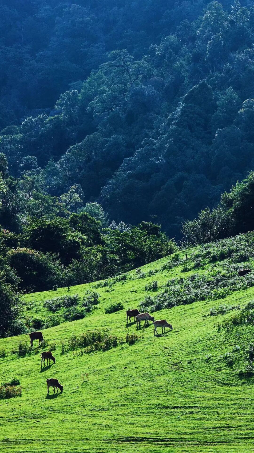 站在坝子间,远远望去,一张深绿色的毯子徐徐覆盖在大地之上,成群的牛羊慢悠悠地低头吃草。