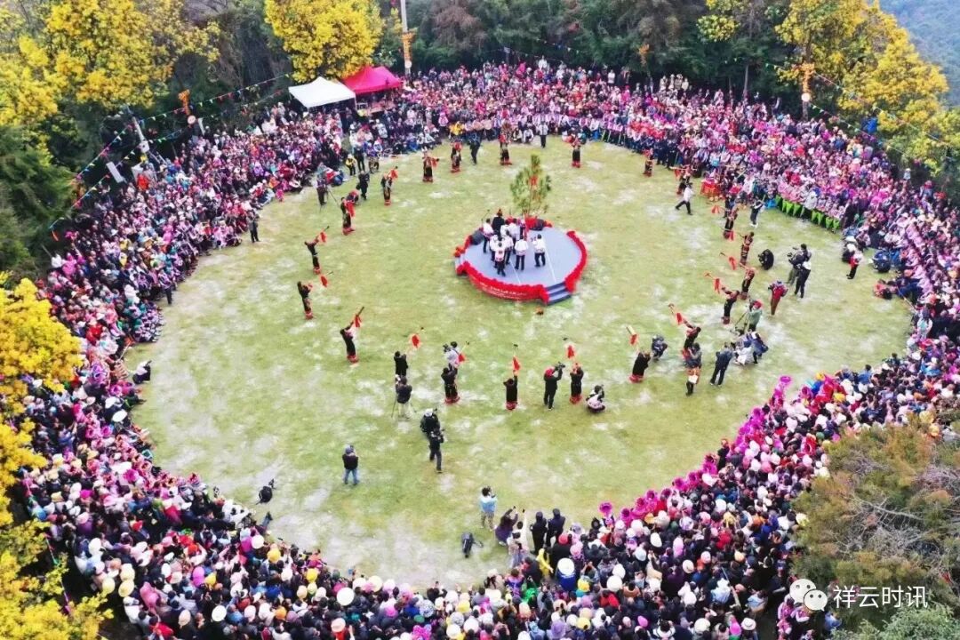 3月6日(农历二月十五),祥云县普淜镇天峰山松树掩映的打歌场上人潮涌动,十里八乡的3万多名各族群众身着美丽的民族盛装欢聚一堂,载歌载舞,共庆一年一度的民族歌会。