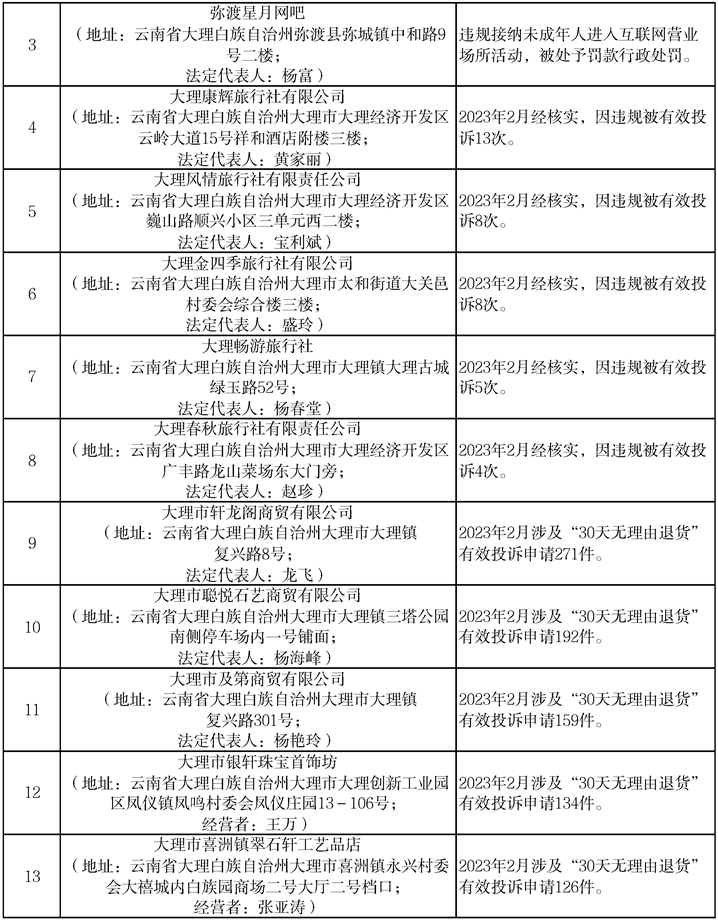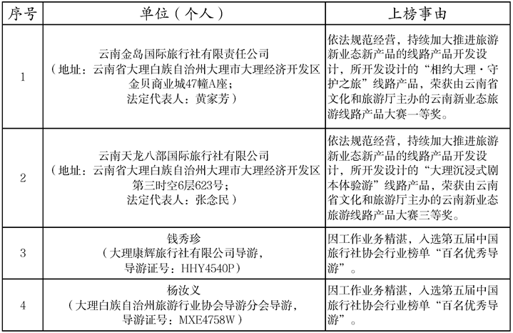 为巩固好旅游市场秩序整治成果,切实维护旅游者合法权益,引导市场良性健康发展,3月9日,大理州旅游市场秩序整治工作领导小组办公室公布了2023年度第2期大理州文化和旅游“红黑榜”名单,表彰行业先进,曝光不良企业和个人,具体名单如下:
