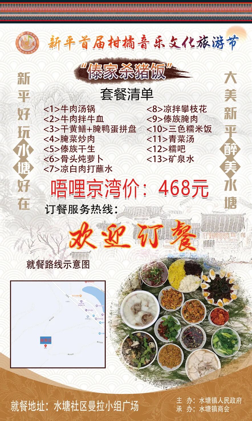 内容:品尝正宗的水塘生态黄牛汤锅、 傣家美食“杀猪饭”(接受预约订餐)