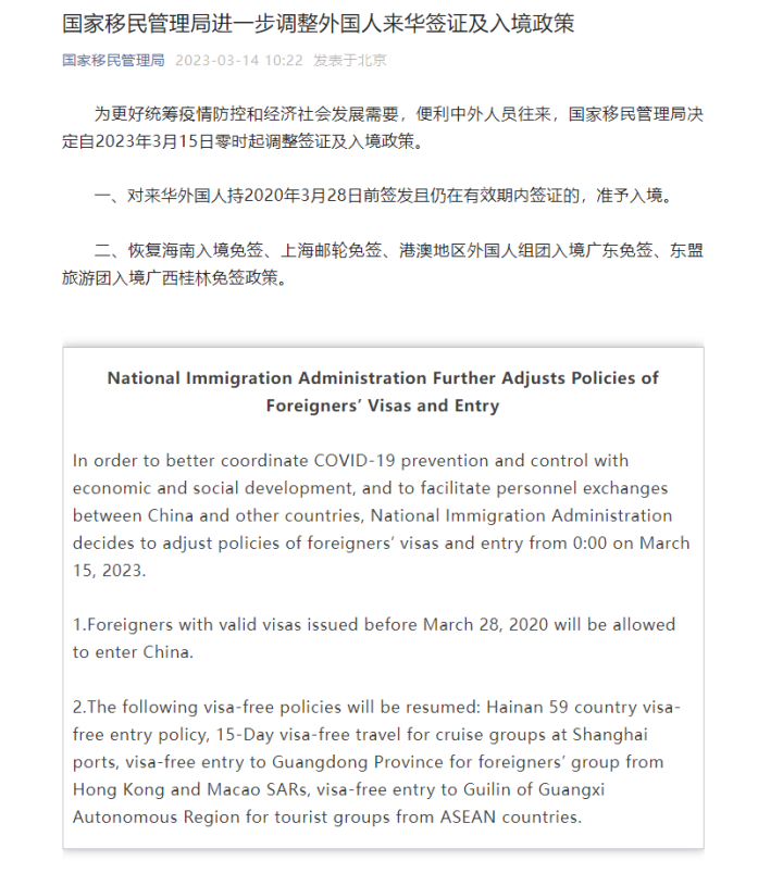 3月14日,国家移民管理局发布公告,为更好统筹疫情防控和经济社会发展需要,便利中外人员往来,国家移民管理局决定自2023年3月15日零时起调整签证及入境政策。