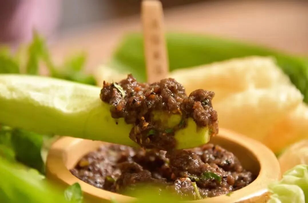 傣族“牛生”可以搭配各种时鲜素菜食用,黄瓜、泡皮、水香菜、生菜等都是其“最佳伴侣”。“牛生”吃起来自带一股炭火香气,又有五加叶的苦味和回甘,一旦尝过便很难忘怀!