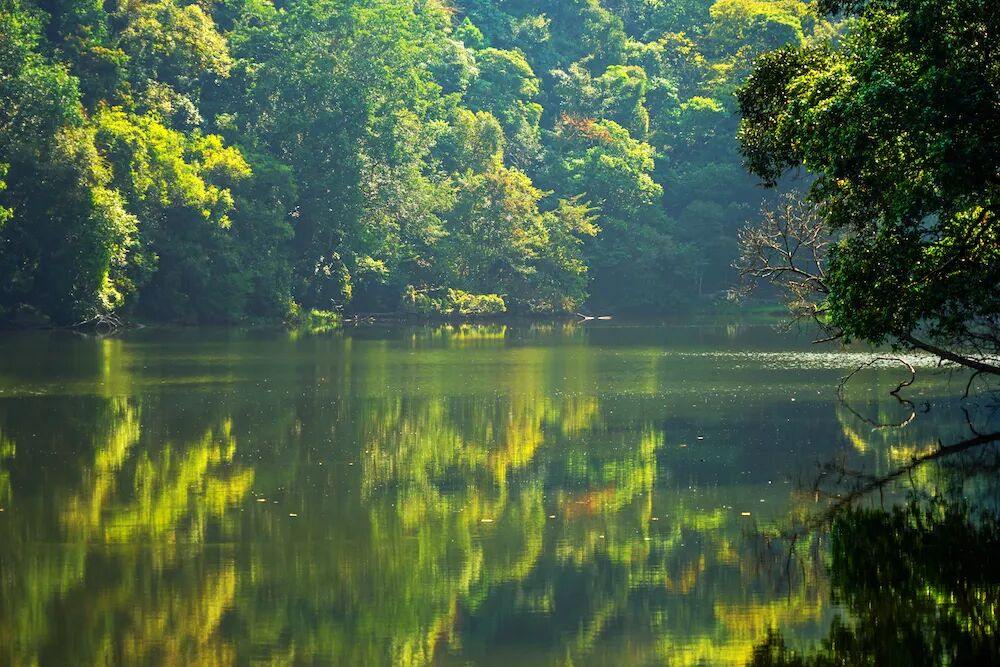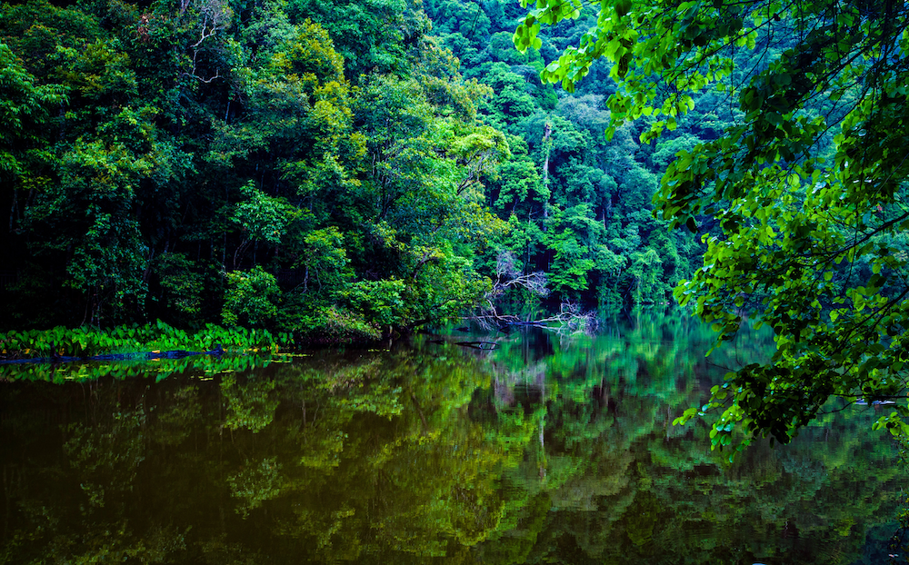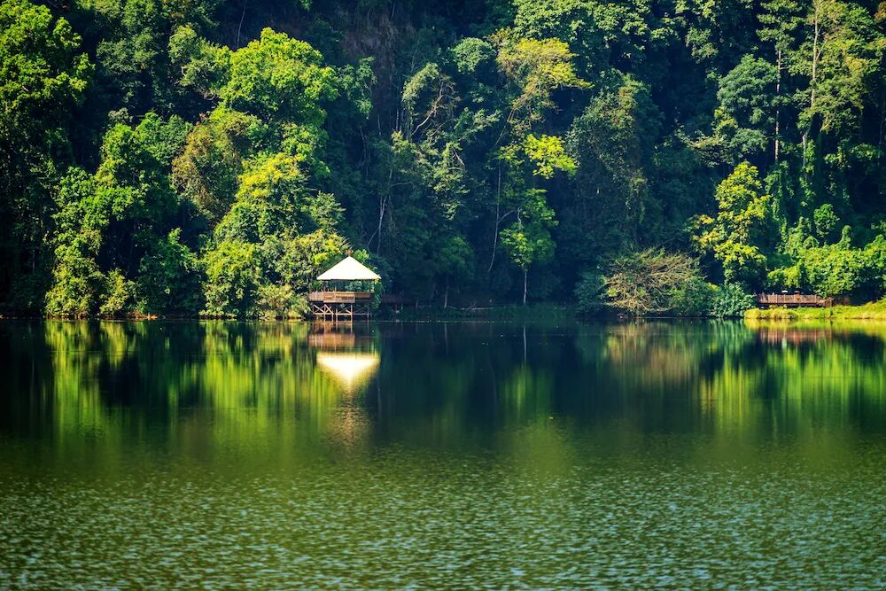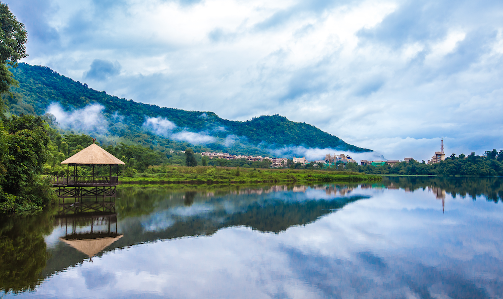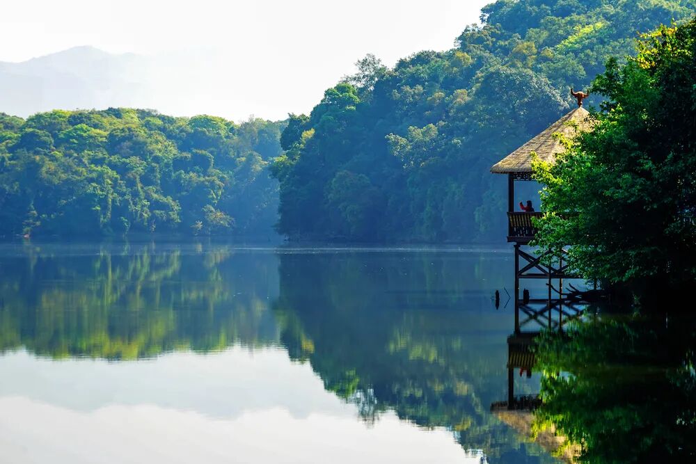 勐梭龙潭的美大气而空灵,激情而不张扬,狂野而不失内敛,这份原始、纯粹的意境,总是能让人停下匆忙的脚步。环顾四周,林翠山青,层峦叠嶂,远山如黛,碧水粼粼,水映山城,一幅“林中有城,城中有水,城在林中,林在水中”的山水画卷缓缓铺展开来。