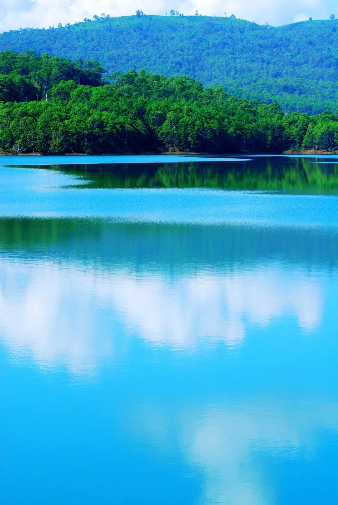湖面在清风吹拂下泛起点点涟漪,在光影作用下宛如无数宝石熠熠生辉。放眼那山与水的融洽,连同堤坝边盛开的花儿一起烂漫,这片满载着湖光山色的“云顶天池”,用它的静谧和幽蓝,描摹出一幅人与自然和谐的美丽画卷。