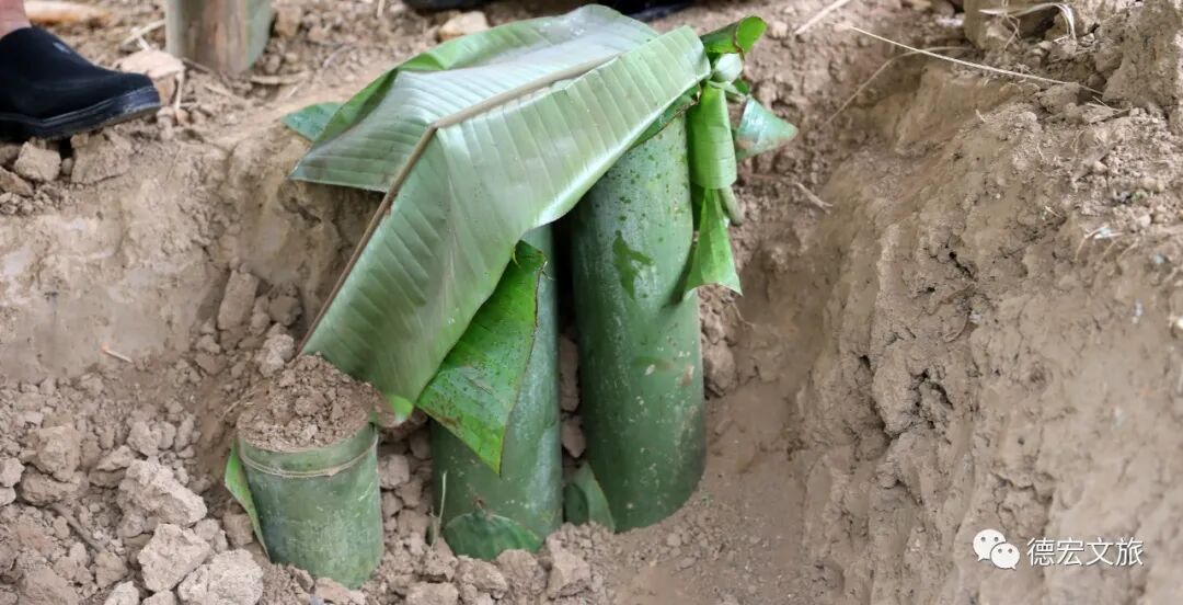 茶叶填满后,用新鲜芭蕉叶封口,选一处阴凉的地方挖一个深坑,垫上芭蕉叶,再将封好的竹筒埋起来,让茶叶在地下以纯天然的方式慢慢发酵。根据光照雨水的变化,大概需要三十至五十天不等。