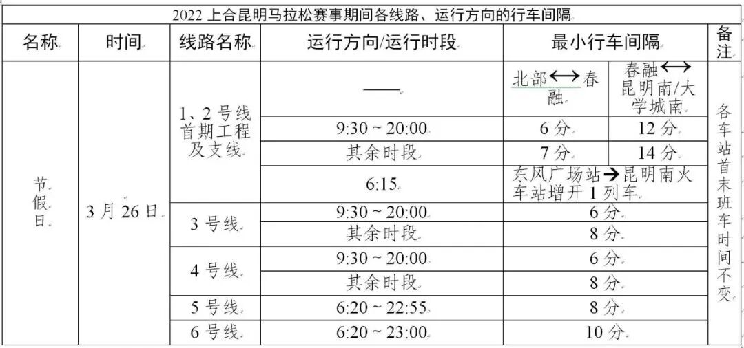 2022上合昆明马拉松赛事期间按双休日运行图正常组织行车。遇特殊情况,以上级部门下达的通知为准。