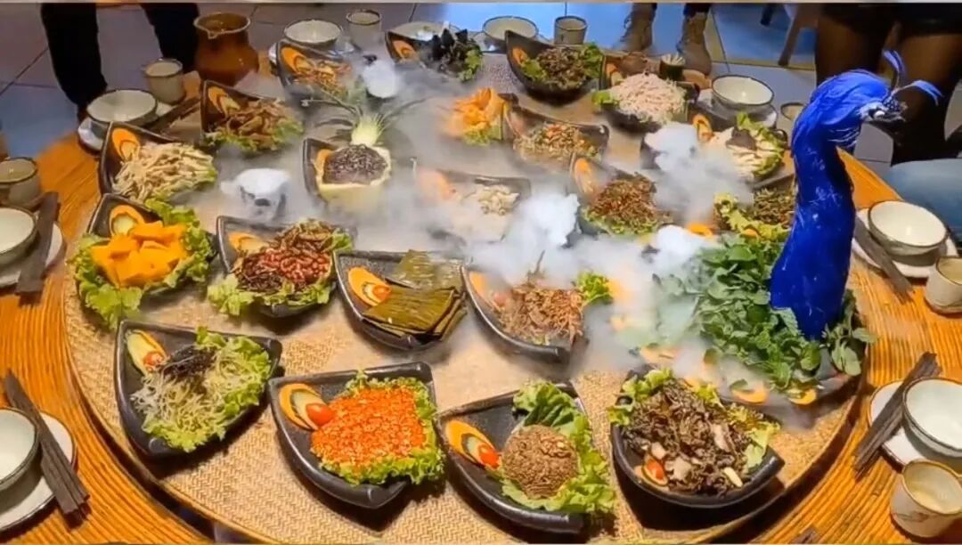 孔雀宴是以孔雀作为宴席造型,在圆桌上铺满大片树叶,所有美食按照圆形摆开,再放上栩栩如生的孔雀头部模型,加上颜色各异的菜品依次陈列,仿佛孔雀开屏。