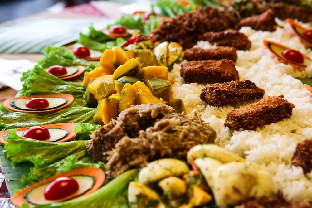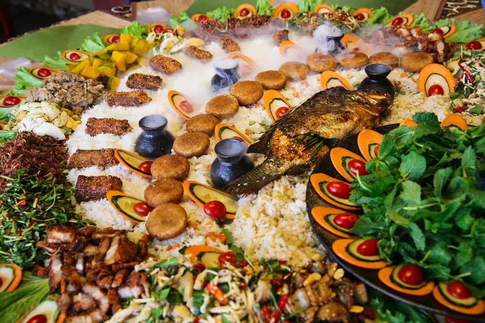 沧源佤王宴以芭蕉叶为盘,由烤乳猪、烤鸡、烤鱼、牛排、牛肚、牛干巴等硬菜为主菜,辅以凉拌野菜(五加尖、香菜、鱼腥草、水芹菜等),加上苦肠汤、青菜汤、各类蔬菜混煮的杂菜汤,以及苦叶小豆汤等各类特色菜组成,并配以辣椒、生姜、大蒜、花椒、山胡椒、食盐捣碎舂成的佐料,主食为鸡肉烂饭、红米饭、糯米饭。