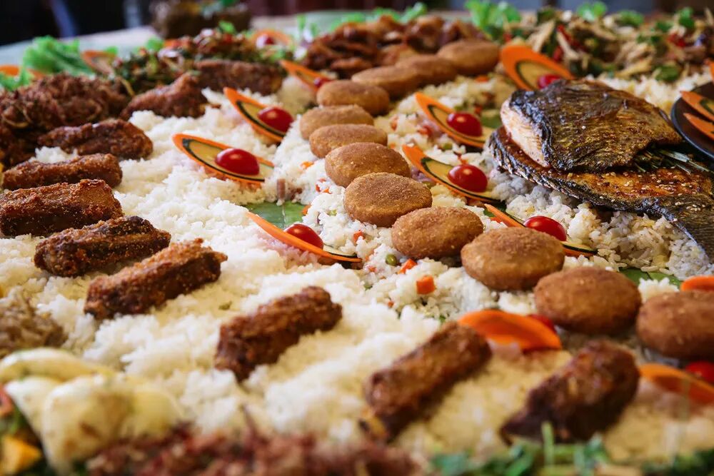 傈僳族手抓饭是怒江傈僳族的特色美食,接待客人或者过节时,怒江当地人会在一个洗涤干净的簸箕内放入切成小块的烤乳猪、土鸡、琵琶肉、荞米鸡肉拌饭和凉拌木耳、清煮南瓜、土豆及特色佐料等。