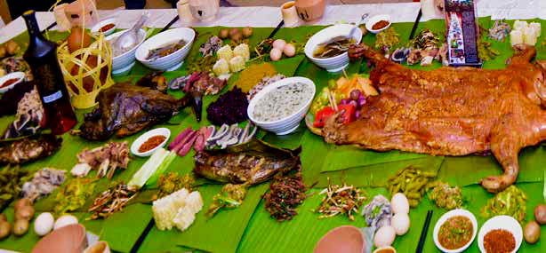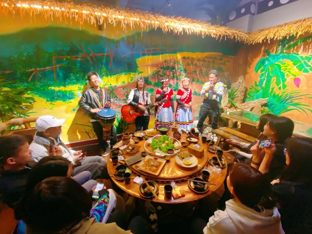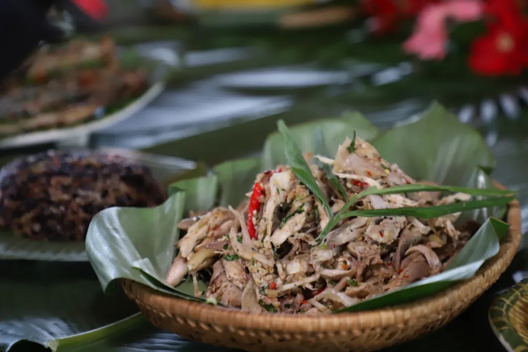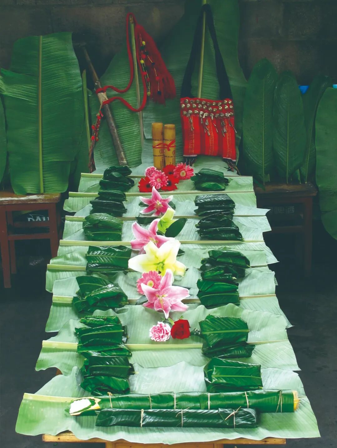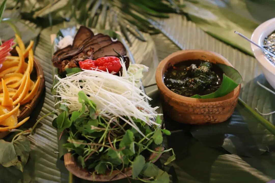 “绿叶宴”上,没有碗、没有勺、没有铁制的酒具,饭是竹筒烧的,菜是竹筒舂的,盛菜的盘是青翠的芭蕉叶,喝汤的勺是树叶折叠成的,就连酒杯也是竹筒做的。吃的是山茅野菜、地道土鸡,从视觉到味觉,都远离了现代饮食的概念,仿佛面对的是一席少数民族的“智慧盛宴”。