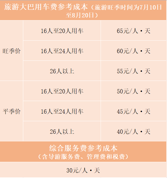 线路成本参考价/人=星级房价/人×入住天数+团队餐价/人×用餐次数+A级旅游景区门票价格/人+用车费/人×用车天数+综合服务费/人×出游天数