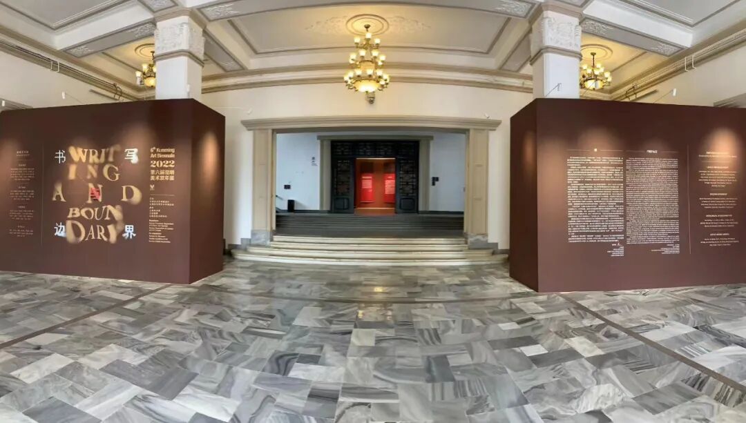 3月的春城昆明到处春意盎然,生机勃勃,空气中弥漫着淡淡的花香。位于城市中心地段的云南美术馆在春日阳光的照耀下显得流光溢彩,金碧辉煌。走近美术馆,墙壁栋梁间,云彩花纹意态多姿,“书写与边界——第六届昆明美术双年展”的巨幅海报欣然悦目。