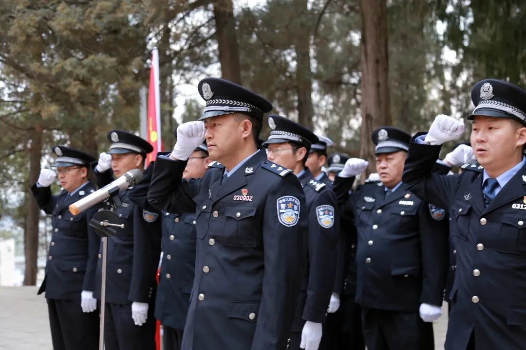 “我志愿加入中国共产党……”在烈士纪念碑前,全体民警紧握右拳,重温入党誓词。