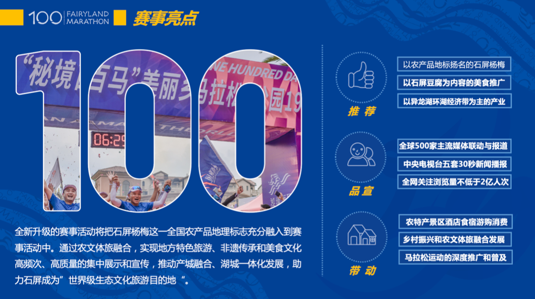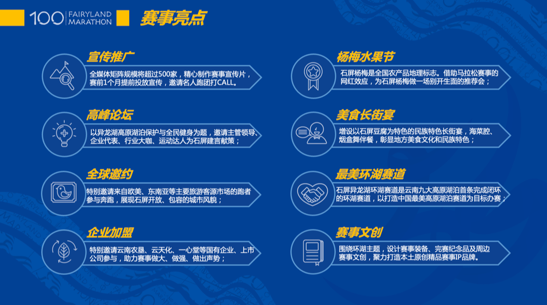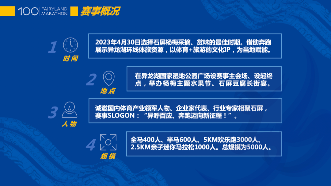 据悉:古韵新城·水墨石屏“2023异呼百应·奔跑迈向新征程”石屏异龙湖环湖马拉松赛事,将于4月30日在石屏异龙湖开赛,赛事项目分为:全程马拉松,42.195公里,400人;半程马拉松,21.0975公里,600人;5公里欢乐跑,3000人;2.5公里亲子迷你马拉松,1000人,赛事规模为5000人。