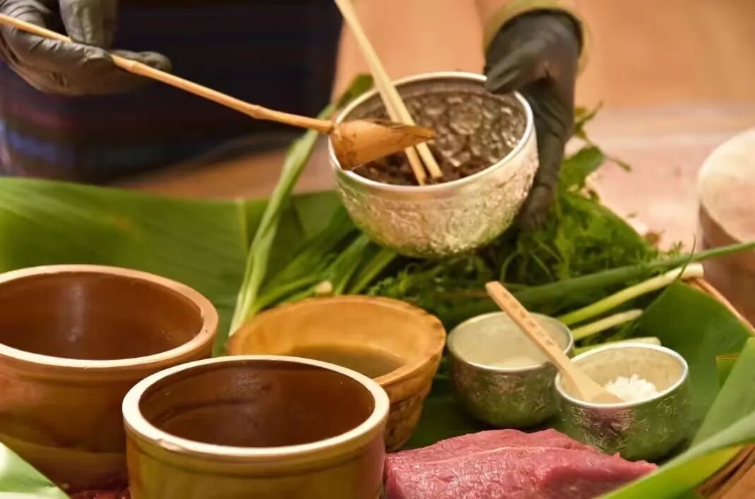 傣族“牛生”的烹饪过程并不复杂,首先要精选本地小黄牛瘦肉切丁,放到盛有火红木炭的土陶罐里迅速搅拌,直至牛肉丁烤熟。再用同样的方法,把八角、野花椒、干辣椒、姜片等佐料烘至散发出焦香后舂细,将烤熟的牛肉丁剁碎成末,撒上盐巴,放入煮好的五加叶汁水里,搅拌均匀,这道色香味俱全的美食就完成了。